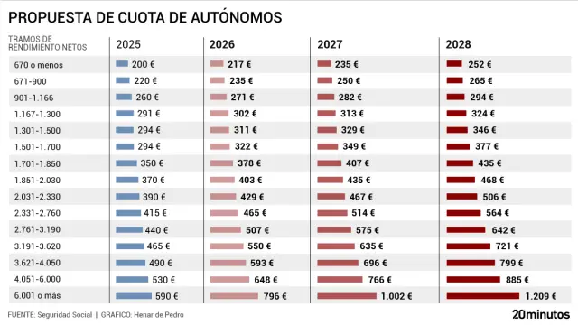 Sin embargo, la propuesta ha generado inquietud entre el colectivo, especialmente entre quienes tienen rendimientos más bajos. Las nuevas tablas —que ya han empezado a circular en los borradores oficiales— prevén un incremento progresivo de las cuotas mínimas, mientras que los autónomos con mayores ingresos verán subidas más significativas.